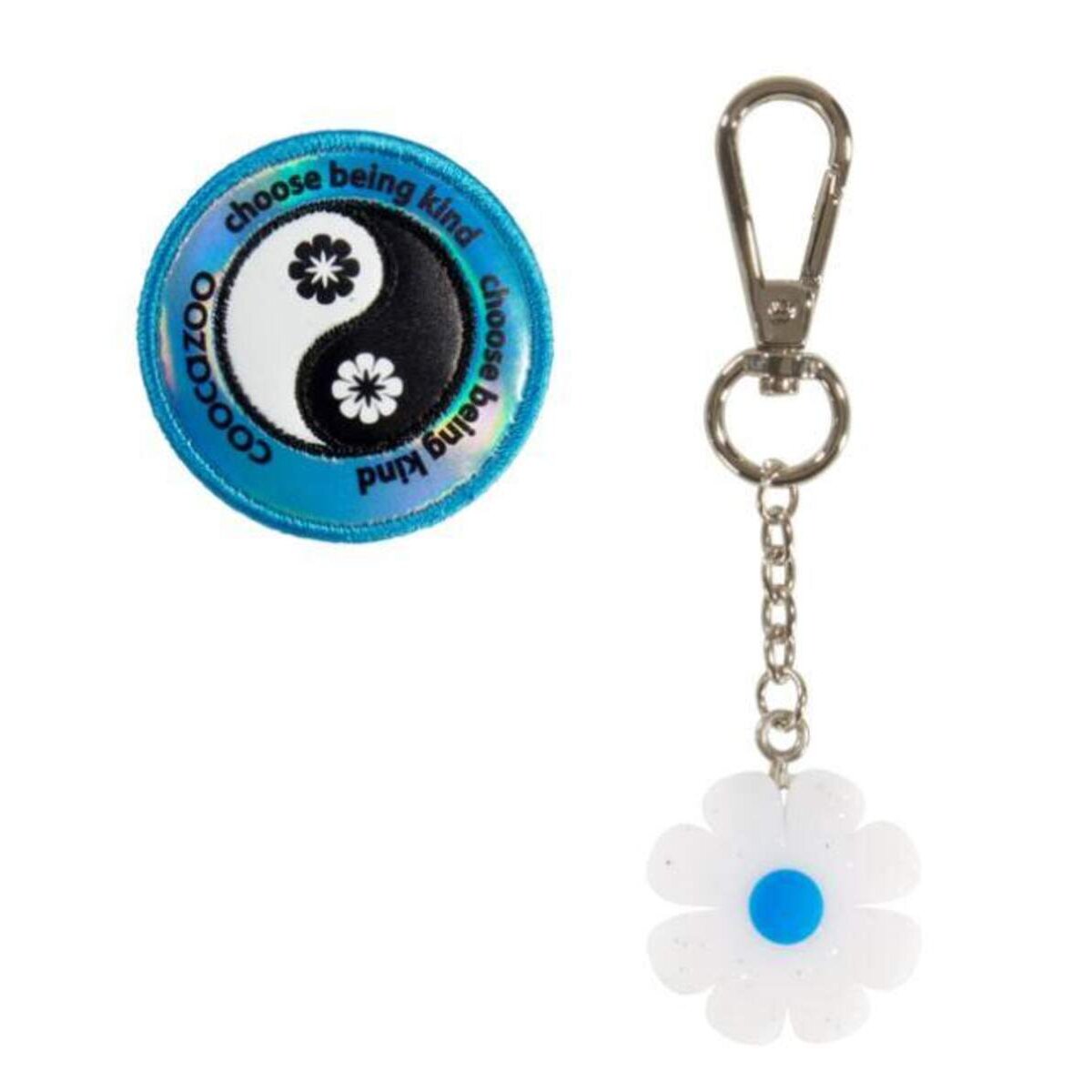 Wer kennt es nicht: Das Yin-Yang-Symbol aus der taoistischen/daoistischen Philosophie. Ein weißer Tropfen mit schwarzem Punkt (Yang) formt mit einem schwarzen Tropfen mit weißem Punkt (Yin) einen Kreis. Dahinter steht der Gedanke, dass jede Kraft auf der Welt einen Gegenpol hat, mit dem sie im Einklang steht. Mit dem COLOUR UP-Set Yin-Yang gibst Du Deinem Kind täglich Balance und Ausgeglichenheit mit auf den Schulweg. Das zweiteilige Set aus Klett-Patch und Anhänger dient als cooles Accessoire für die individualisierbaren Schulrucksäcke von coocazoo. Der runde Sticker schimmert aufgrund seiner blau bedruckten Hologrammfolie besonders schön. Darauf gedruckt ist das Yin-Yang-Symbol. Ein Highlight sind die gestickten Außenlinien, die zwei Blumen im Symbol und die Aufschrift „choose being kind“ – was für eine schöne Message! Der Silikonanhänger stellt eine weiß-blaue Blume dar und ergänzt das Klett-Patch perfekt.