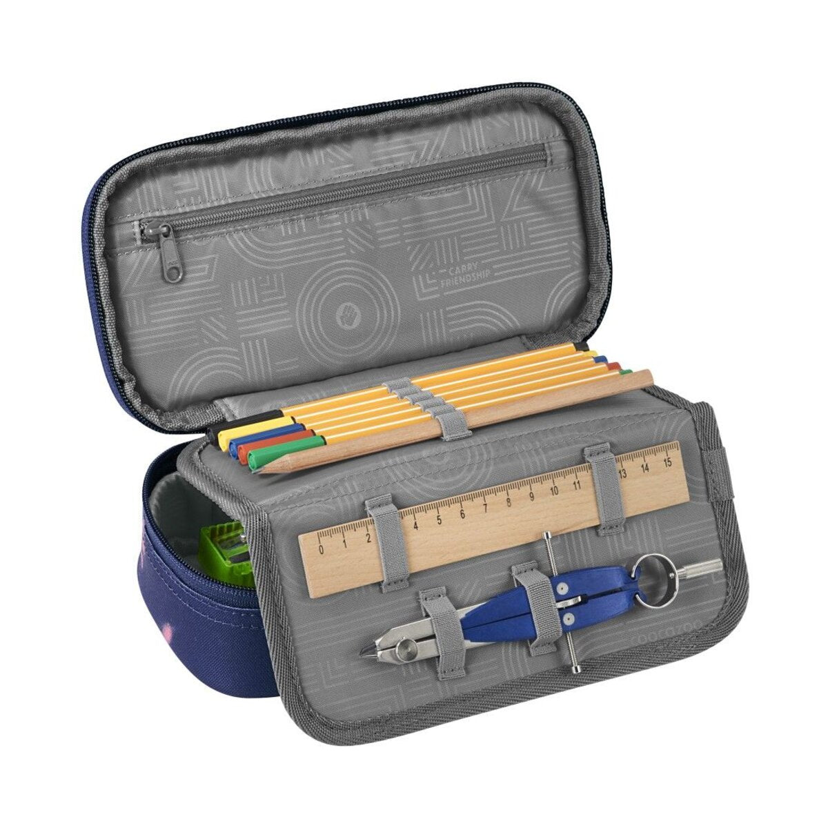 - Extra Fächer für Lineal, Zirkel und Geodreieck